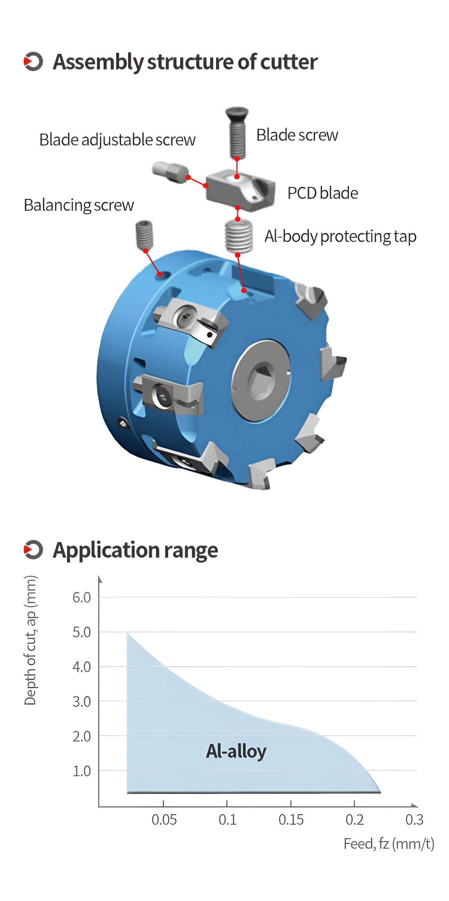 Aero Mill-Plus ha integrato il copritruciolo e la lama. Per migliorare l'interferenza del truciolo sul copritruciolo e la durata del PCD, è stato applicato un sistema di applicazione diretta che ha aumentato la durata della fresa fino al 20%.