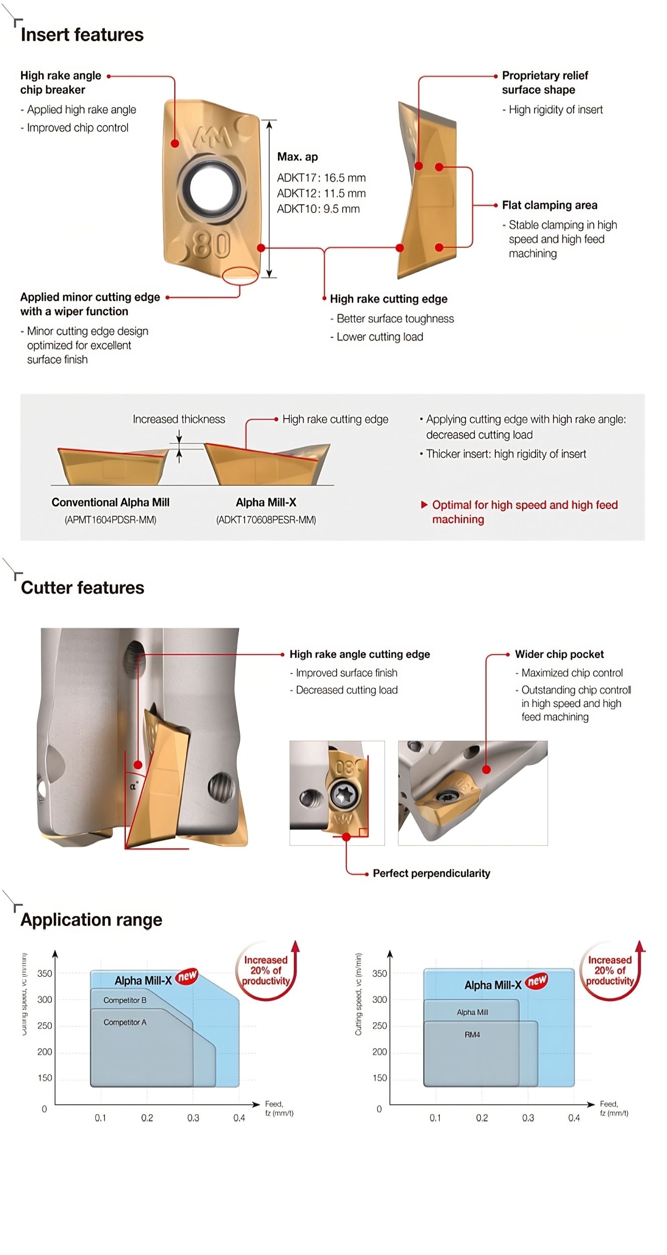 Alpha Mill-X, con un naso-R di varie dimensioni e qualità ottimali per ogni condizione di taglio, aumenta la produttività nella lavorazione ad alta velocità e avanzamento con prestazioni elevate.