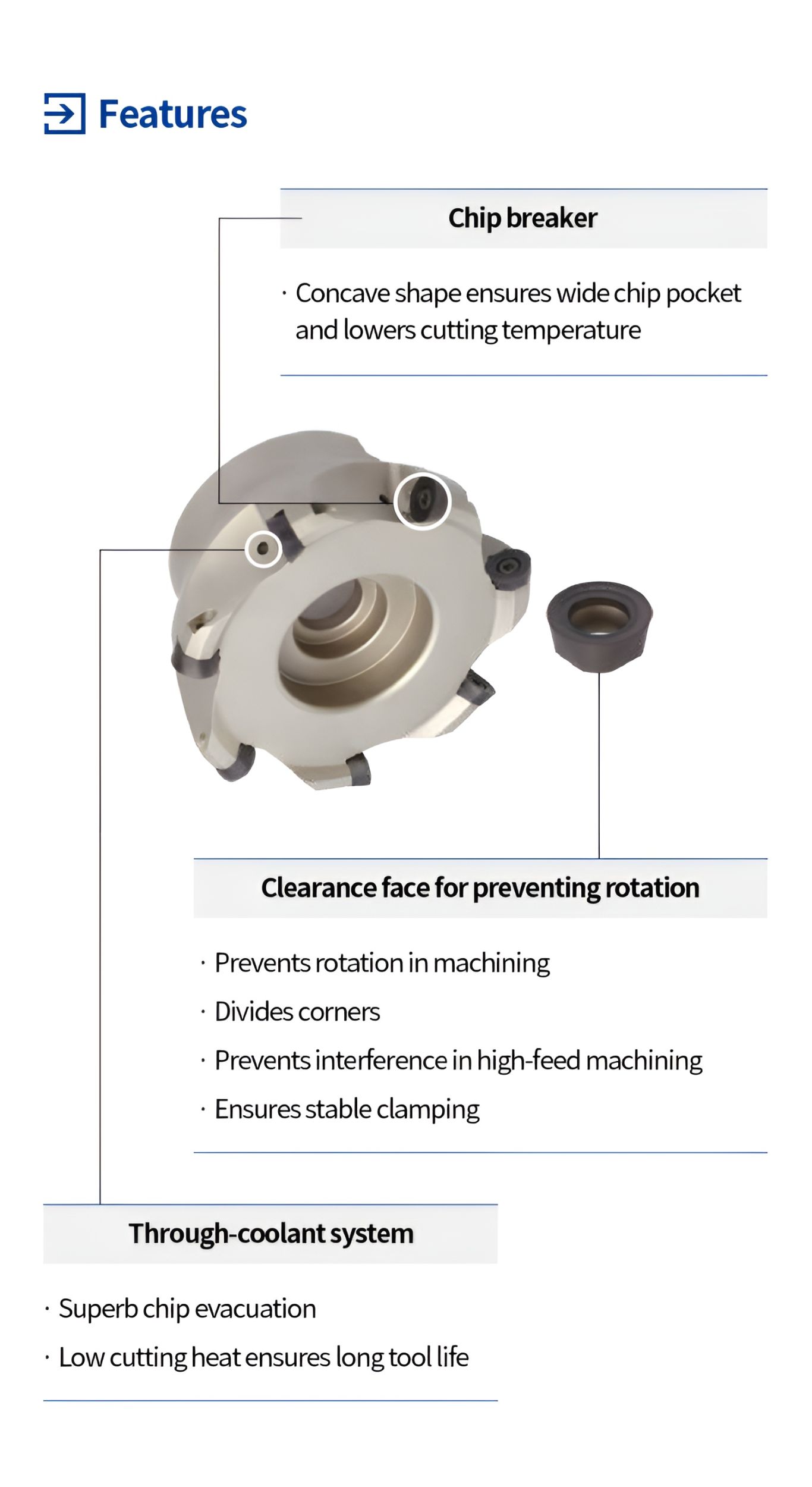 L'FMR P-positive è disponibile per la maggior parte delle applicazioni. In caso di profondità di taglio inferiori a 0,039 pollici, l'angolo di taglio è inferiore a 15° per la fresatura ad alto avanzamento. Ha anche capacità di taglio ad alta profondità fino alla metà della dimensione dell'inserto (0,157~0,394 pollici). Il taglio ad alta profondità e la lavorazione ad alto avanzamento consentono di aumentare la produttività. Infatti, gli utensili ad alto avanzamento formano trucioli più sottili nella stessa condizione di avanzamento, contribuendo a ridurre la forza di taglio. L'FMR P-positive è la scelta ideale, soprattutto quando si vuole migliorare la produttività o utilizzare una potenza ridotta.