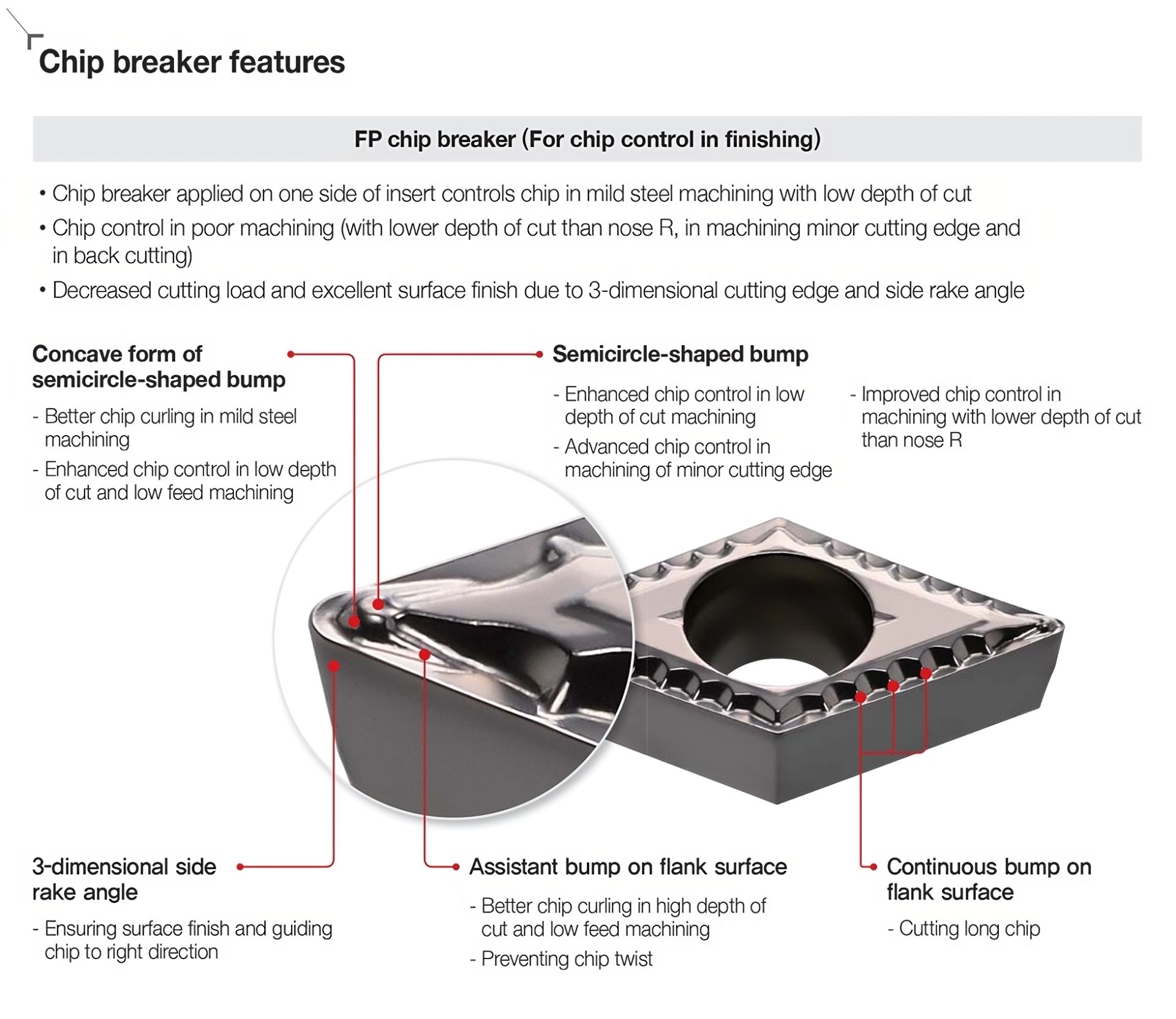 Il rompitruciolo FP, grazie all'applicazione di un tagliente tridimensionale ottimale e di una protuberanza a forma di semicerchio, consente di evitare l'arricciamento del truciolo in fase di finitura e di prevenire il blocco del truciolo, garantendo la comodità della lavorazione automatica.