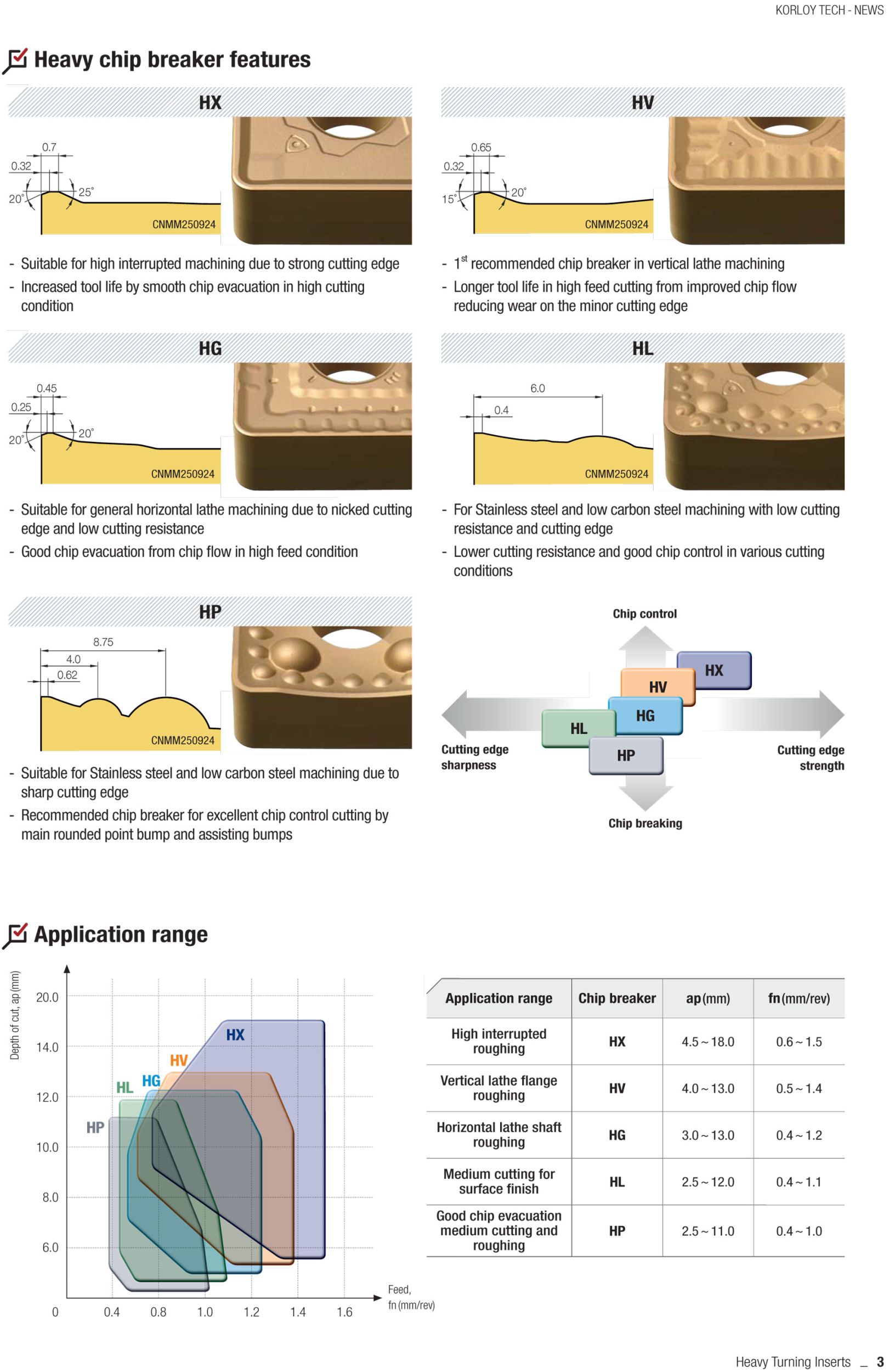 KORLOY ha lanciato di recente diversi rompitruciolo come HL, HP, HG, HV, HX per la sgrossatura media di pezzi di grandi dimensioni e gradi esclusivi come NC515H, NC520H e NC525H per la tornitura pesante.