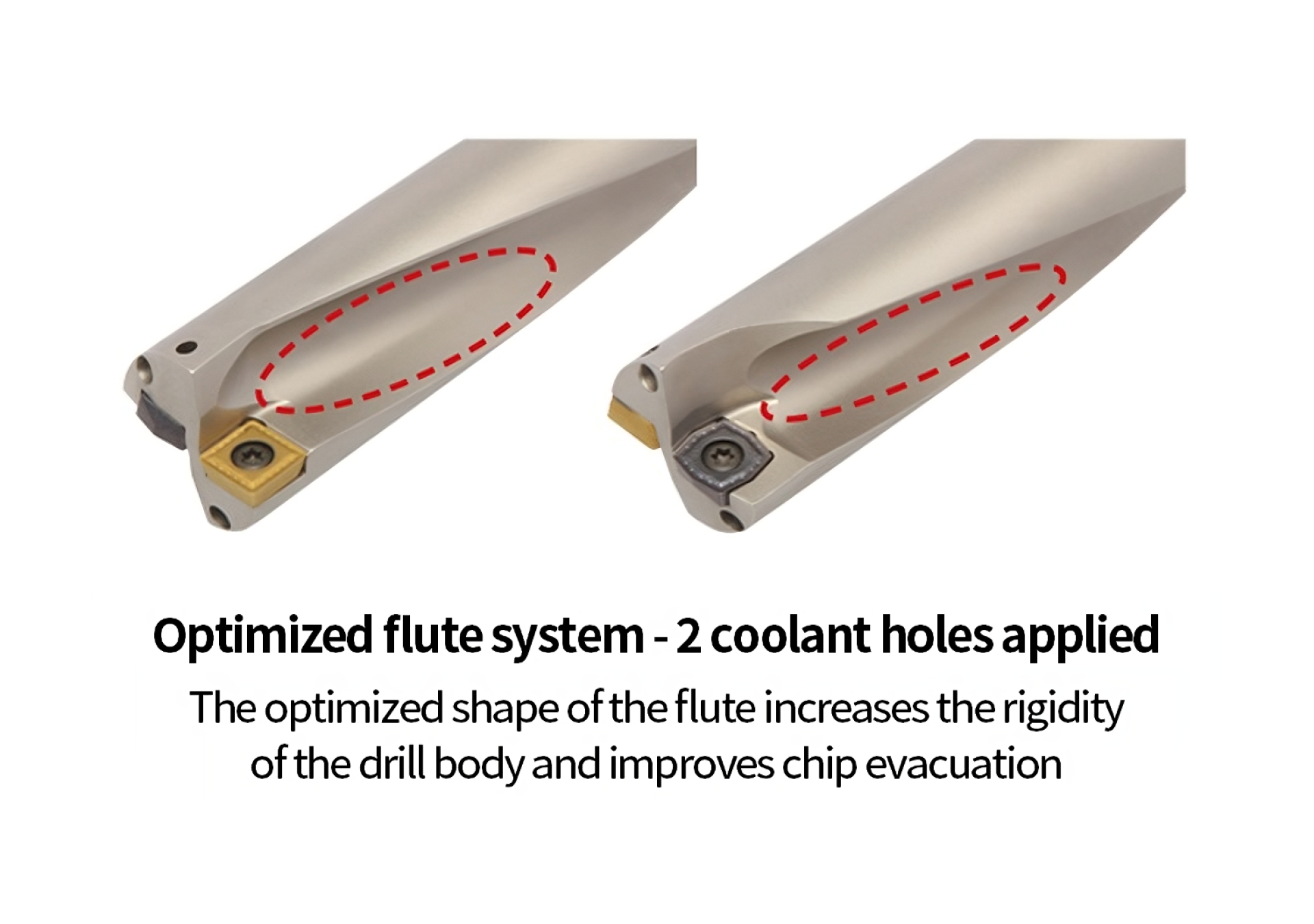 Il design ottimizzato della lama e della scanalatura della KING DRILL migliora l'efficacia dei meccanismi di foratura grazie alla formazione e alla forma del truciolo. I fori elicoidali per l'olio della KING DRILL producono una una più agevole evacuazione dei trucioli.