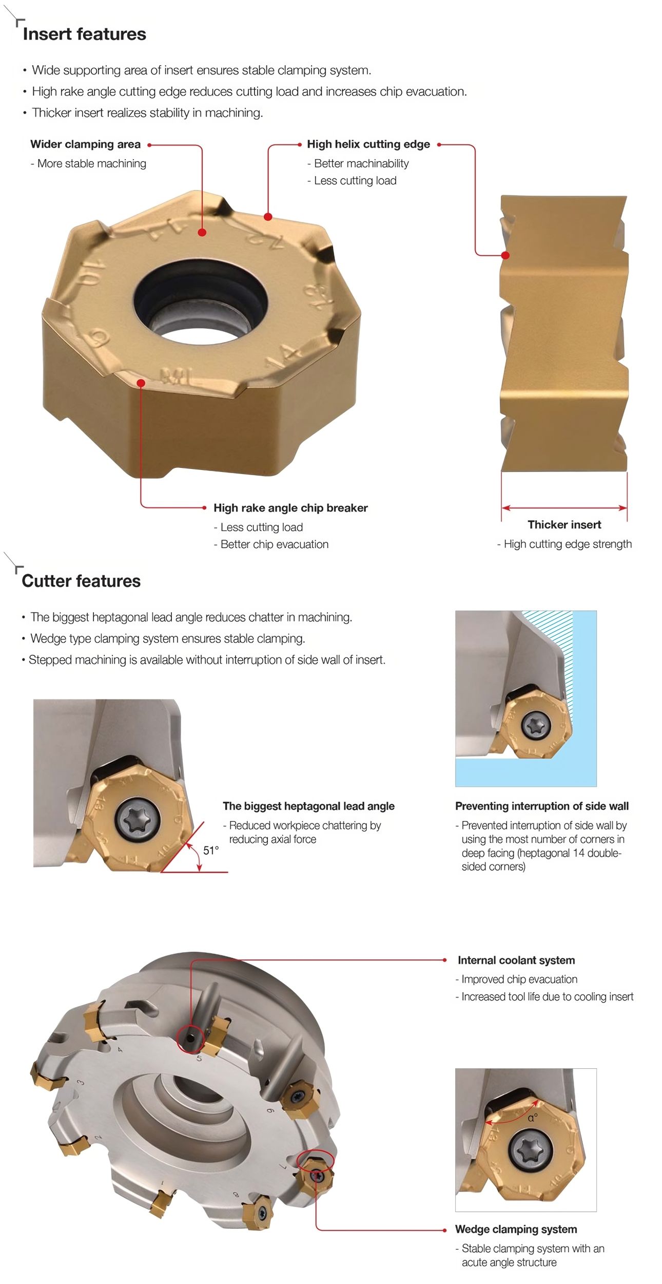 La RM14, progettata con un angolo di attacco massimo di 51˚ di forma eptagonale, riduce il carico di taglio e le vibrazioni rispetto alle frese frontali convenzionali con angolo di attacco di 45˚. Il robusto sistema di serraggio a cuneo garantisce una durata stabile dell'utensile anche in condizioni di taglio sfavorevoli.