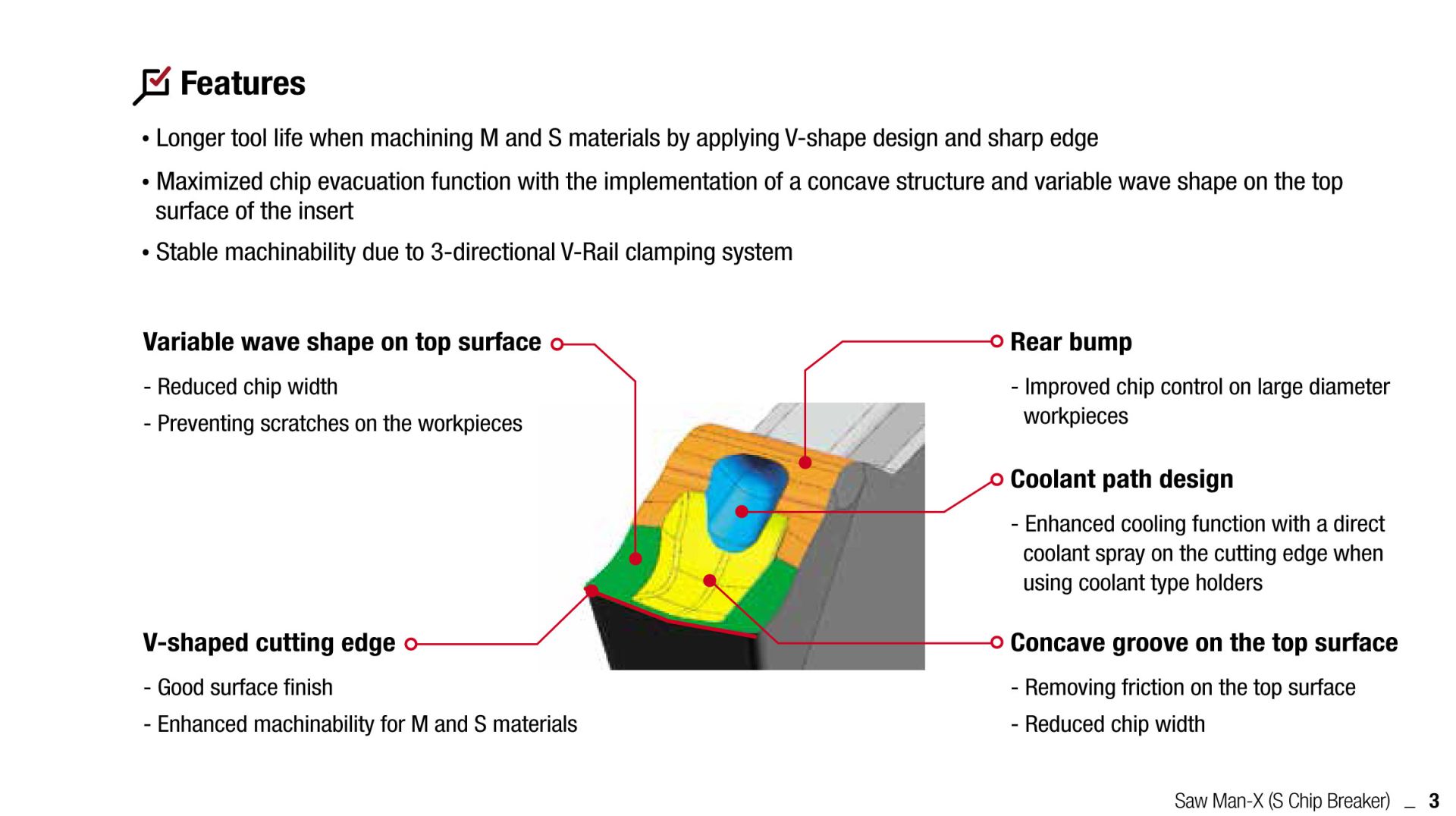 Il rompitruciolo S riduce al minimo il carico di taglio grazie al suo tagliente affilato e al tagliente maggiore concavato. Inoltre, migliora l'evacuazione dei trucioli riducendo il calore di taglio e minimizzando l'ampiezza dei trucioli grazie all'applicazione di una scanalatura concavata e di un design a forma di onda variabile sulla superficie superiore.