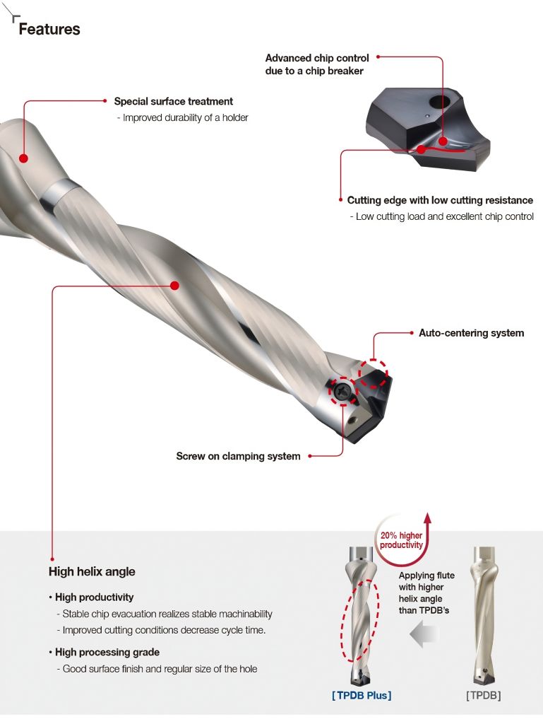 Inoltre, TPDB Plus previene l'inceppamento del truciolo o la frattura imprevista anche nella foratura profonda con oltre 8D e garantisce una lavorabilità più stabile.