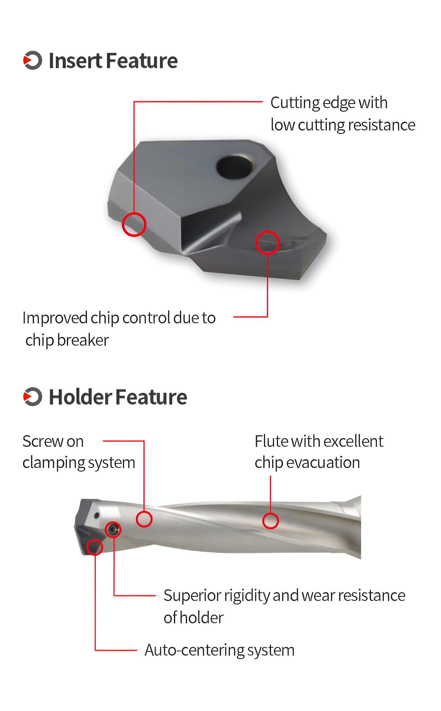 La TPDB è inoltre dotata di rompitrucioli tridimensionali proprietari di KORLOY sulle scanalature. Questo sistema migliora il controllo e il flusso del truciolo per un'eccellente finitura superficiale. Il trattamento superficiale avanzato del portautensili e la tecnologia di rivestimento dell'inserto massimizzano la durata dell'utensile.